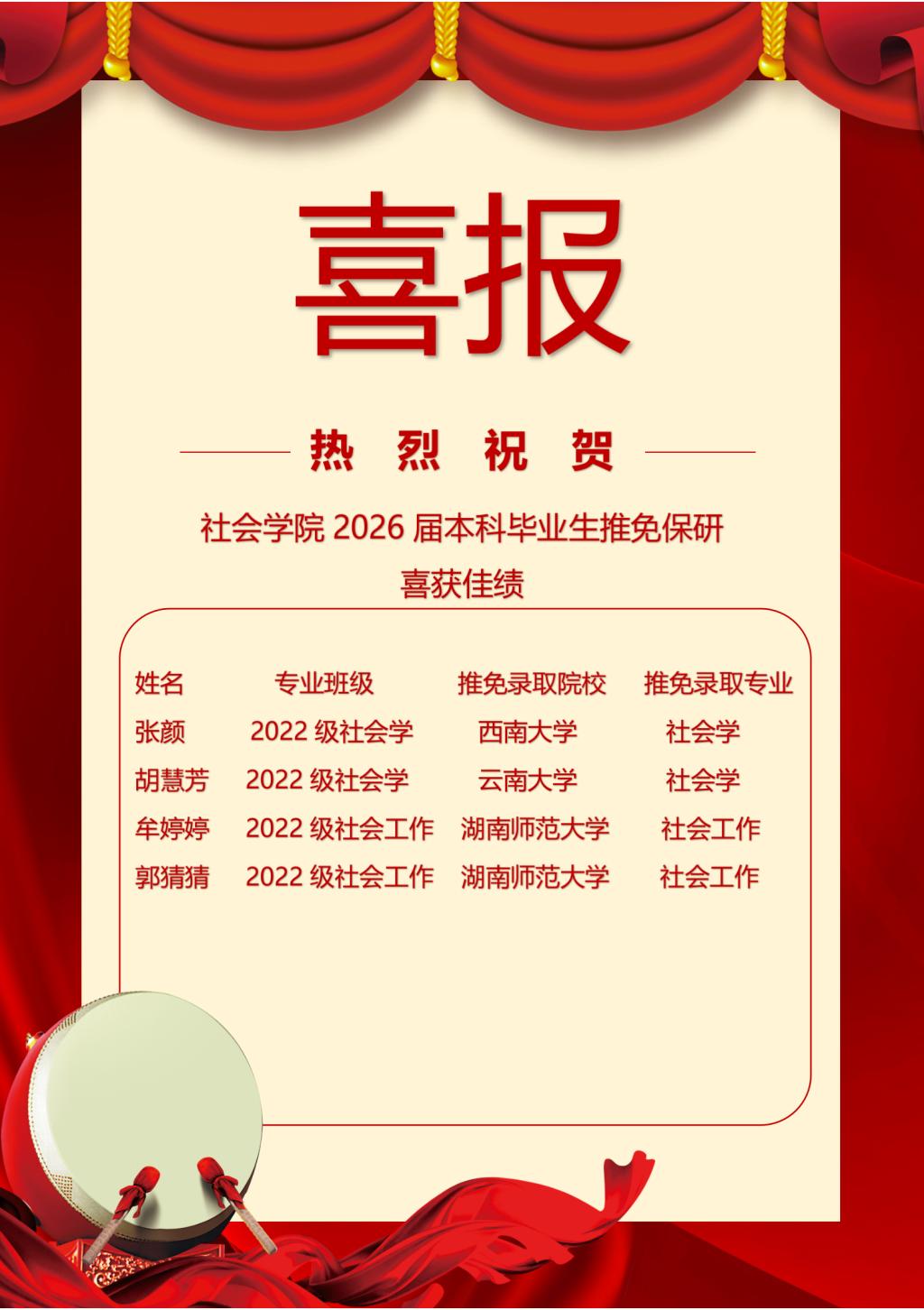 风起于青萍之末,浪成于微澜之间。社会学院学子在2026届本科毕业生推荐免试攻读研究生工作中,以卓越表现交出了一份亮眼的答卷。张颜、胡慧芳、牟婷婷、郭猜猜等四位同学凭借扎实的学术功底及全面的综合素质,成功斩获国内双一流高校的推免资格,录取院校涵盖西南大学、云南大学、湖南师范大学等。 长风破浪会有时,直挂云帆济沧海。本次推免工作是我院首次推荐本科毕业生免试攻读硕士研究生,首次推免成功的背后,是学子们日...