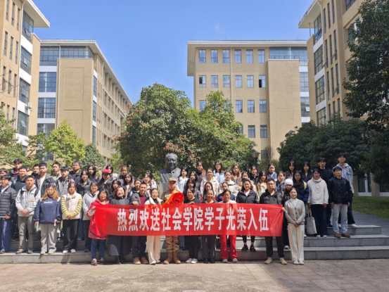 身着戎装踏征程,少年壮志护山河。3月11日中午,社会学院举行新兵入伍欢送仪式,热烈欢送2024级社会工作专业黄璨祥同学应征入伍。学院党委副书记裴凡苗、辅导员文琴、王素霞、入伍新兵及亲友、学生代表参加了此次欢送会,会议由辅导员王素霞主持。 图1 欢送会现场 仪式上,裴凡苗副书记为入伍新兵黄璨祥颁发了纪念品,小小纪念品承载着母校的关怀与期盼,饱含着对黄璨祥同学军旅生涯的美好祝福。学生代表吴晓悦送上祝福,讲述黄...