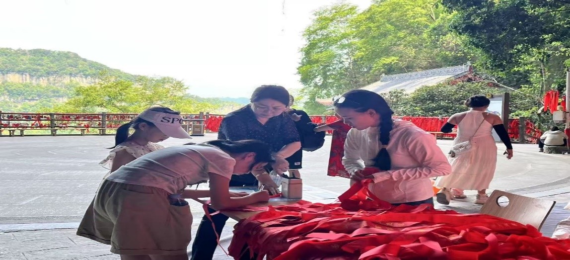 同时,团队结合景区宣传需要设置“扫码领取祈福丝带”活动区域,向游客介绍九龙洞的文化背景及祈福习俗,鼓励游客通过扫码参与互动,在丝带上写下祝福心愿,做到“景”与“情”的有机融合,增强游客对九龙洞的认同与记忆。