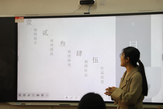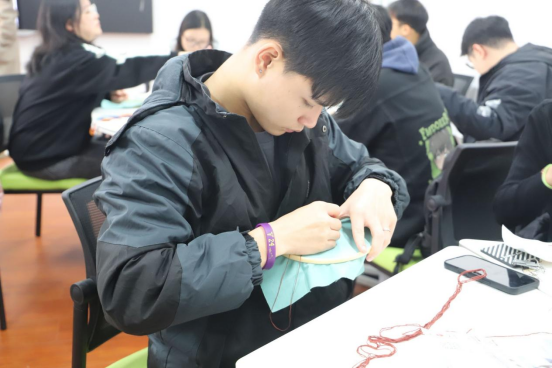 刺绣活动现场,学院特别邀请建工学院田淇老师担任指导。田老师以“刺绣的文化脉络与技艺传承”为主题,系统讲解了刺绣的起源演变、中国四大名绣的艺术特色,重点阐释了汉族经典绣法与少数民族特色绣法的差异及工艺要点。为帮助师生直观感受刺绣艺术的魅力,田老师还现场展示多幅经典刺绣作品,结合作品解析针法技巧与创作思路,并通过手把手示范,指导大家掌握穿针引线、纹样勾勒、针法运用等基础技能,让零基础的师生也能快速入门。在田老师的悉心指导下,师生们兴致高涨、踊跃实践。针线在指尖灵活穿梭,原本普通的布料逐渐绽放出鲜活纹样,现场弥漫着专注投入的创作氛围,充分展现了师生对传统技艺的浓厚热情。