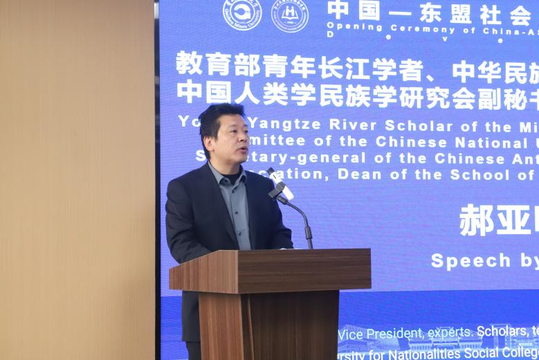 教育部青年长江学者、中华民族团结进步协会专家委员会委员、中国人类学民族学研究会副秘书长、贵州民族大学社会学院院长郝亚明在开幕式中介绍了社会学院在教育、科研、文化等多个领域取得的丰硕成果,以及学院师资力量、社会学学科发展基本情况。他希望与会专家学者能够充分利用这一平台,深入交流、凝聚共识,为中国—东盟社会发展贡献真知灼见,并预祝此次研讨会圆满成功。